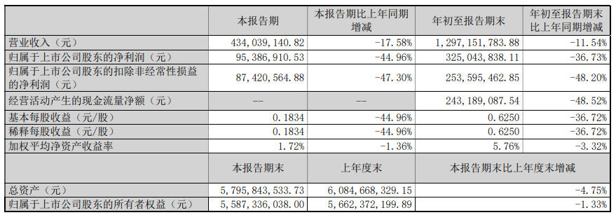 前三季度,敷尔佳实现营业收入12.97亿元,同比下降11.54%;归属于上市公司股东的净利润(下称“净利润”)3.25亿元,同比下降36.73%。其中,第三季度实现营业收入4.34亿元,同比下滑17.58%;归属于上市公司股东的净利润9538.69万元,同比下降44.96%。