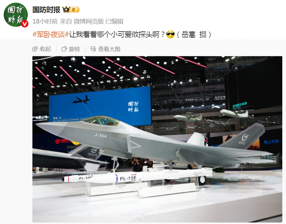 政知君注意到,图片中的装备系在航展展台中展示的国产歼-35A隐身战机和霹雳-15E空空导弹。