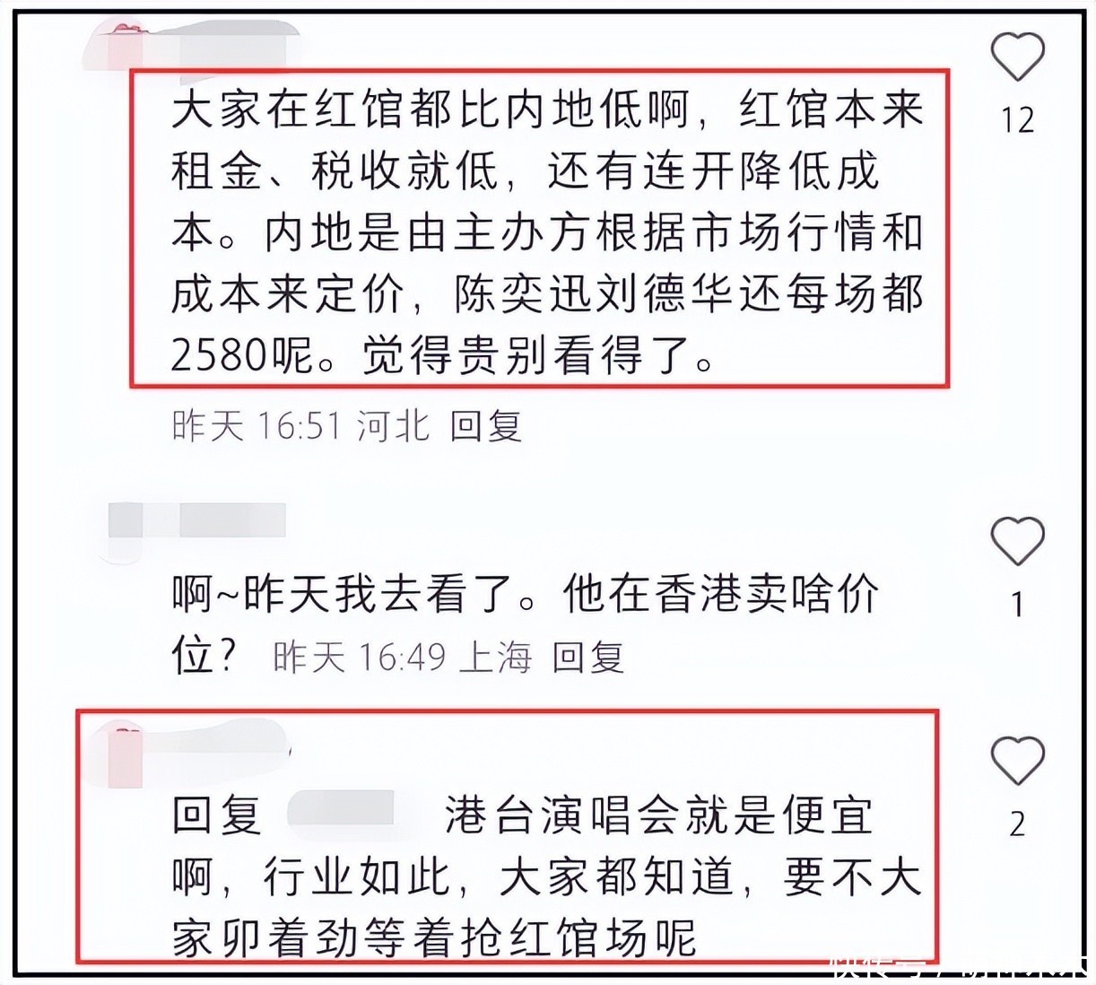 看到质疑,张学友的歌迷在评论区解释称,香港红馆的演唱会门票,一直以来都是比内地的便宜,不仅仅是张学友一人如此,其他的港台明星也是这样。