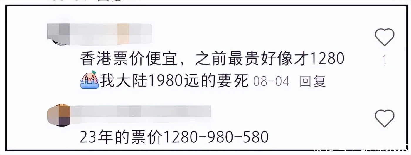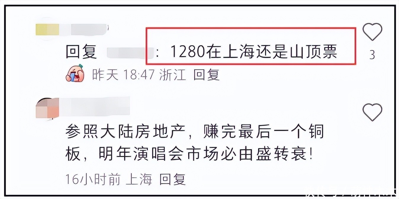 这条评论有不少赞同的声音,有人表示在上海买了1280的门票,视觉却像在山顶。还有人透露,香港演唱会最贵的前排门票,也才1200。