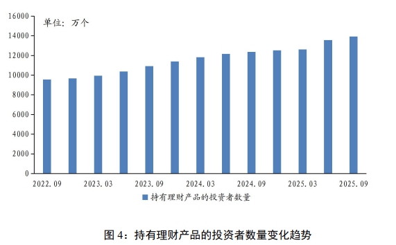 2025年三季度,理财投资者数量维持增长态势。截至2025年三季度末,持有理财产品的投资者数量达1.39亿个,同比增长12.70%。