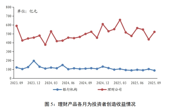 2025年前三季度,理财产品累计为投资者创造收益5689亿元。其中,三季度理财产品累计为投资者创造收益1792亿元:银行机构累计为投资者创造收益283亿元,理财公司累计为投资者创造收益1509亿元。