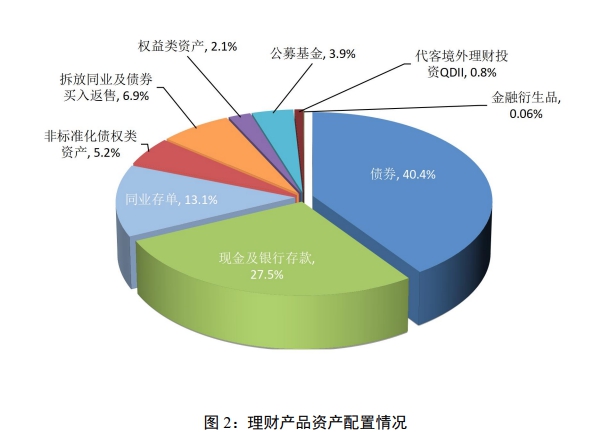 理财产品资产配置以固收类为主,投向债券、现金及银行存款、同业存单余额分别为13.86 万亿元、9.45万亿元、4.50万亿元,分别占总投资资产的40.4%、27.5%、13.1%。
